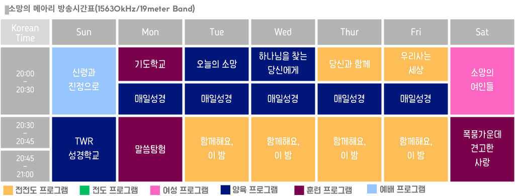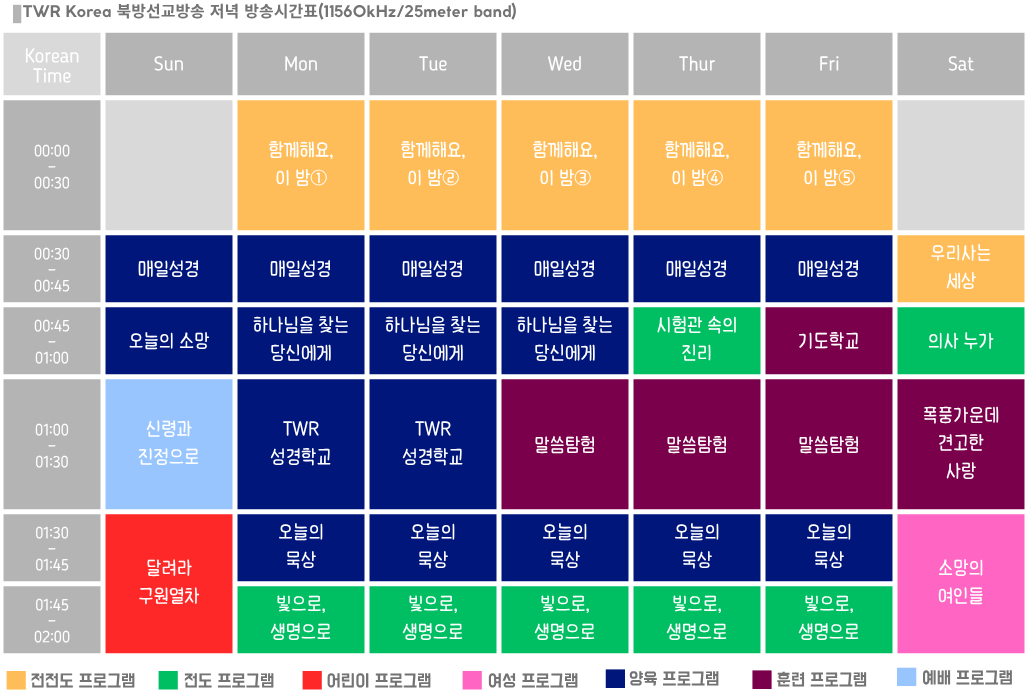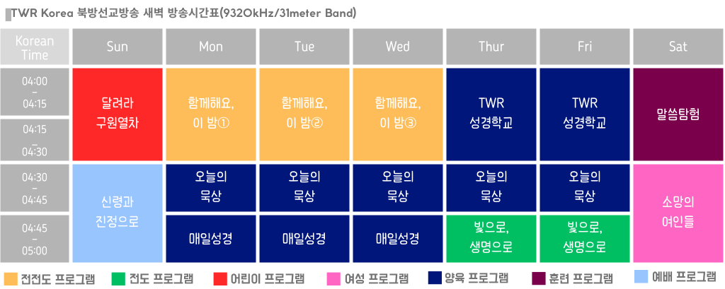 “성경을 아는 만큼 신앙이 자란다” 성도에게 신앙의 성장을 위해 성경을 읽고 공부하는 것은 매우 중요합니다. TWR 성경학교는 북한 지하교회 성도들에게 주 2회 성경공부(신약)를 제공하여, 예수 그리스도로 구원 얻는 신앙을 고백한 “새신자”의 신앙이 성장하도록 돕고 있습니다. 기독교를 박해하기 때문에 교회에서 체계적인 성경공부를 할 수 없는 북한의 지하교회 성도들이 방송을 들음으로 성경을 알아 신앙이 자라게 합니다.