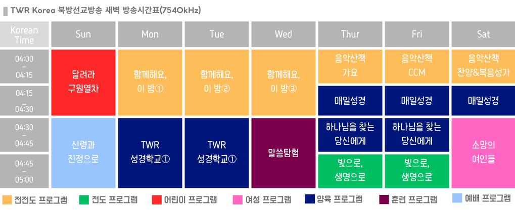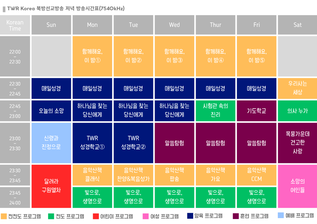 “성경을 아는 만큼 신앙이 자란다” 성도에게 신앙의 성장을 위해 성경을 읽고 공부하는 것은 매우 중요합니다. TWR 성경학교는 북한 지하교회 성도들에게 주 2회 성경공부(신약)를 제공하여, 예수 그리스도로 구원 얻는 신앙을 고백한 “새신자”의 신앙이 성장하도록 돕고 있습니다. 기독교를 박해하기 때문에 교회에서 체계적인 성경공부를 할 수 없는 북한의 지하교회 성도들이 방송을 들음으로 성경을 알아 신앙이 자라게 합니다.