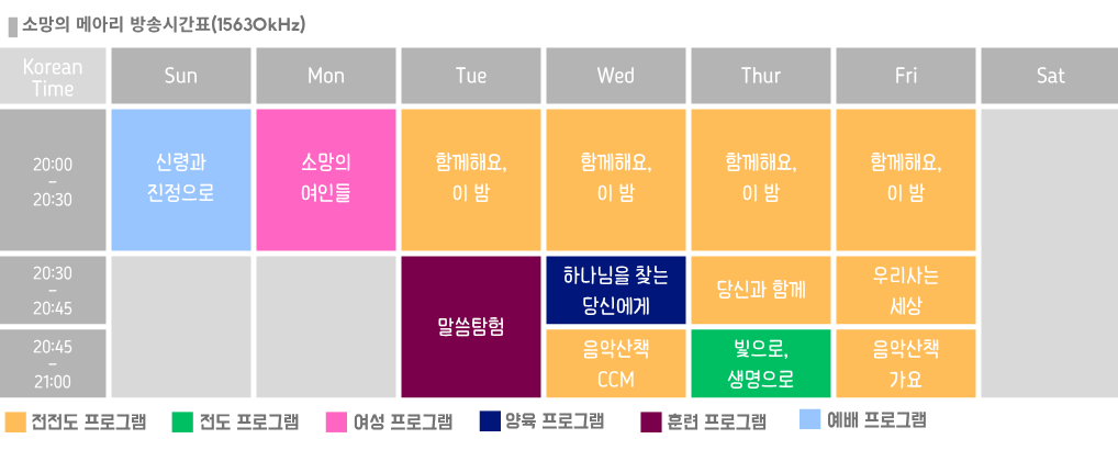 ‘함께해요, 이 밤’은 전전도 프로그램입니다. 이 방송의 목표는 복음에 대해서 들어보지 못하고, 교회와 하나님에 대해 적대감을 가지고 있는 북한 내 청취자들이 경계심과 적대감을 누그러뜨리고 마음을 열어 전도, 양육 방송을 듣게 하는데 있습니다. 그러기 위해 기독교적 색채를 최대한 배제하고, 은연중에 표현하여 접근을 쉽게 하였습니다.